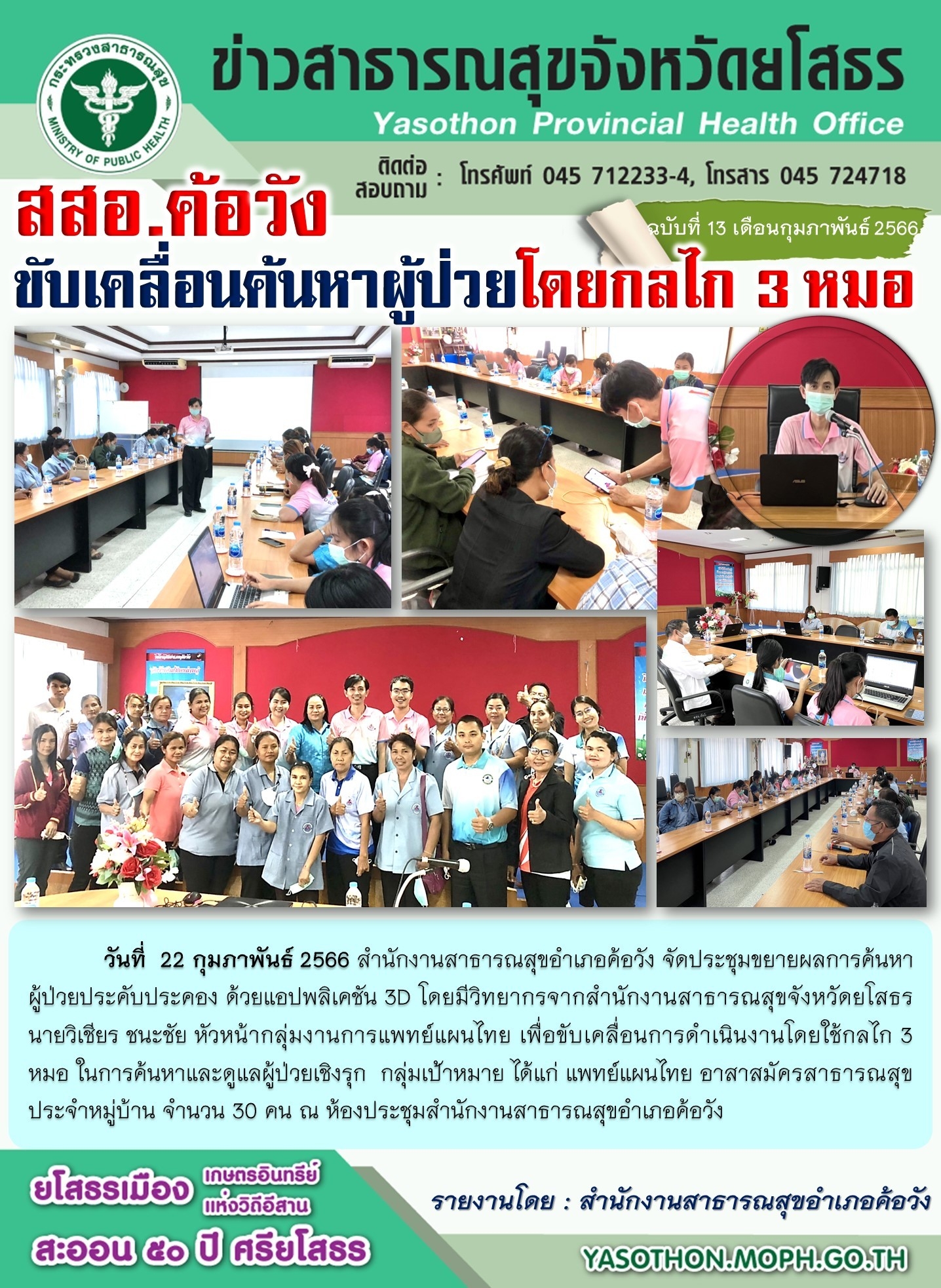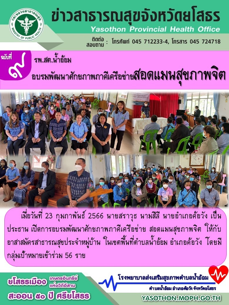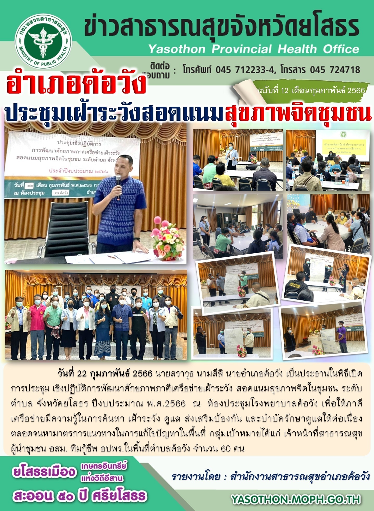 เมื่อวันที่ 23 กุมภาพันธ์ 2566 ที่ผ่านมา นายสราวุธ นามสีลี นายอำเภอค้อวังได้เป็นประธานในพิธีเปิดการประชุมเชิงปฏิบัติการพัฒนาศักยภาพภาคีเครือข่ายเฝ้าระวัง สอดแนมสุขภาพจิตในชุมชน ระดับตำบล...