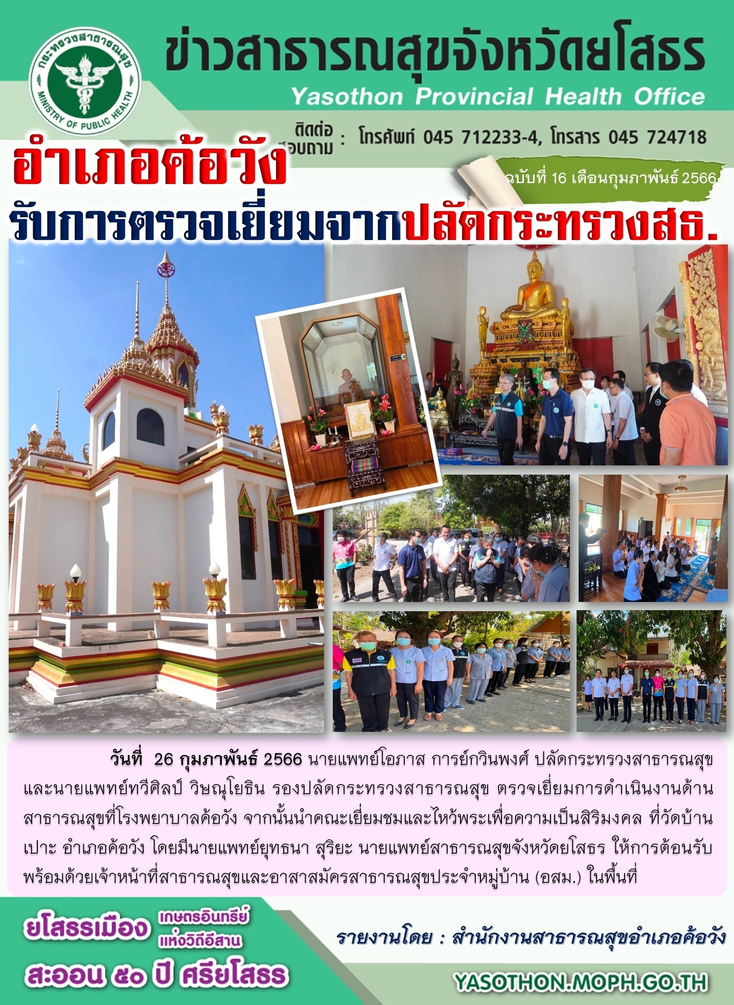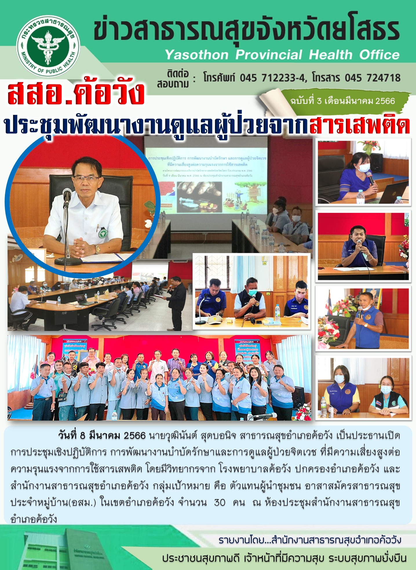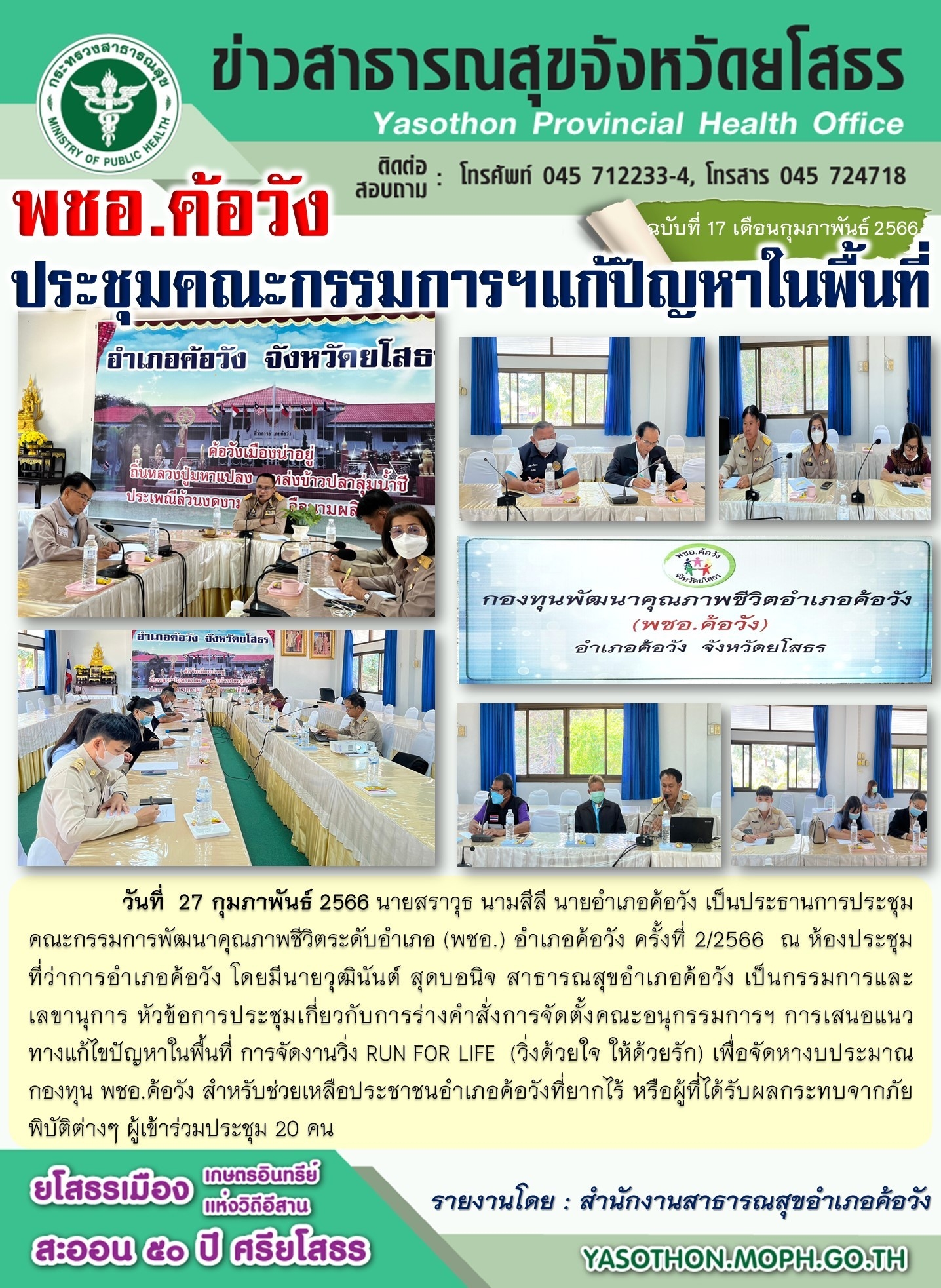 เมื่อวันที่ 23 กุมภาพันธ์ 2566 ที่ผ่านมา นายสราวุธ นามสีลี นายอำเภอค้อวังได้เป็นประธานในพิธีเปิดการประชุมเชิงปฏิบัติการพัฒนาศักยภาพภาคีเครือข่ายเฝ้าระวัง สอดแนมสุขภาพจิตในชุมชน ระดับตำบล...