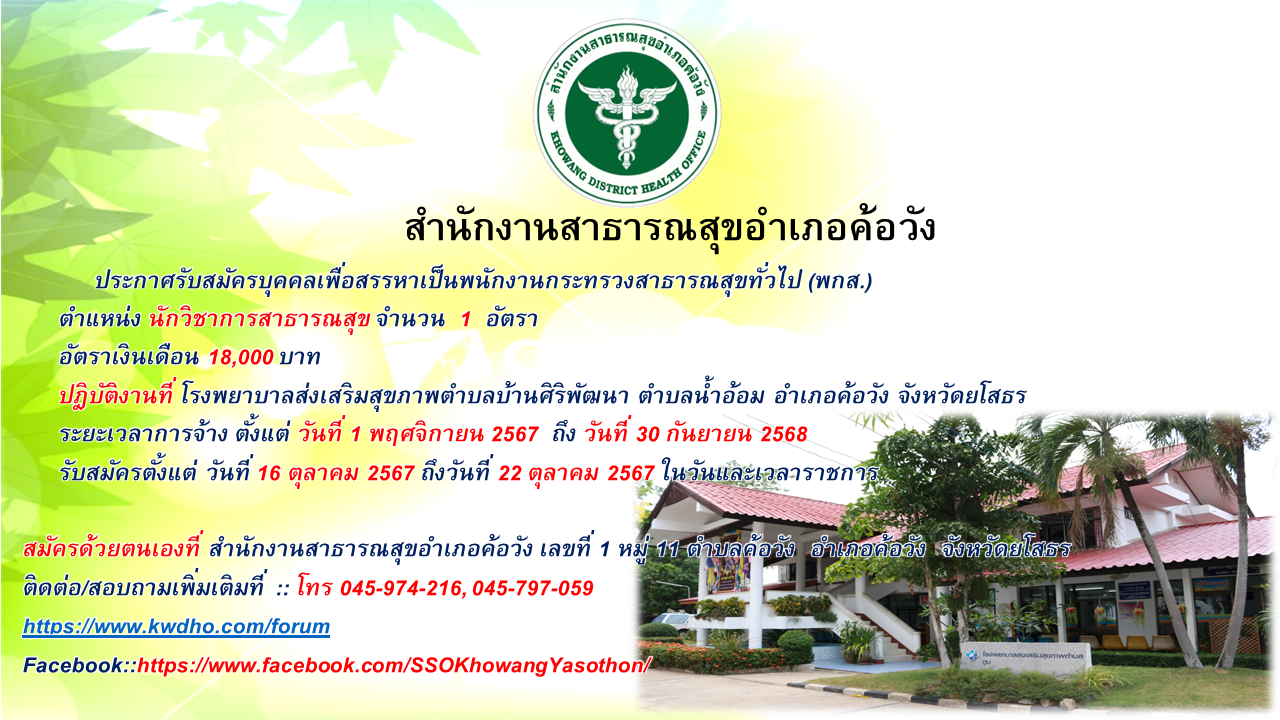 สมัครด้วยตนเองที่ สำนักงานสาธารณสุขอำเภอค้อวัง เลขที่ 1 หมู่ 11 ตำบลค้อวัง อำเภอค้อวัง จังหวัดยโสธร