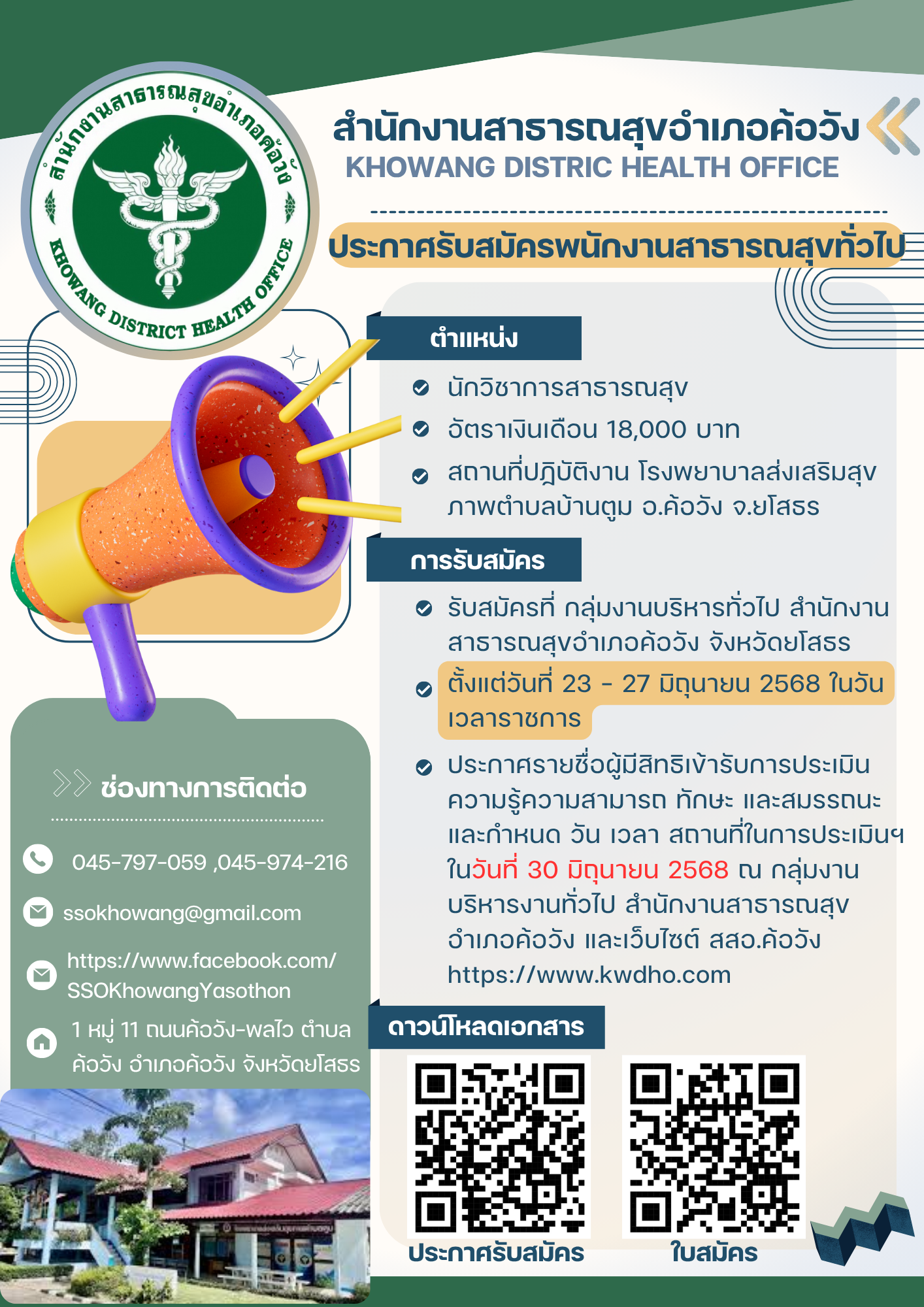 สมัครด้วยตนเองที่ สำนักงานสาธารณสุขอำเภอค้อวัง เลขที่ 1 หมู่ 11 ตำบลค้อวัง อำเภอค้อวัง จังหวัดยโสธร